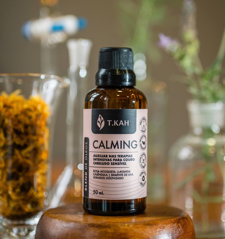 O Blend Calming alivia a irritação e descamação do couro cabeludo e peles sensíveis.